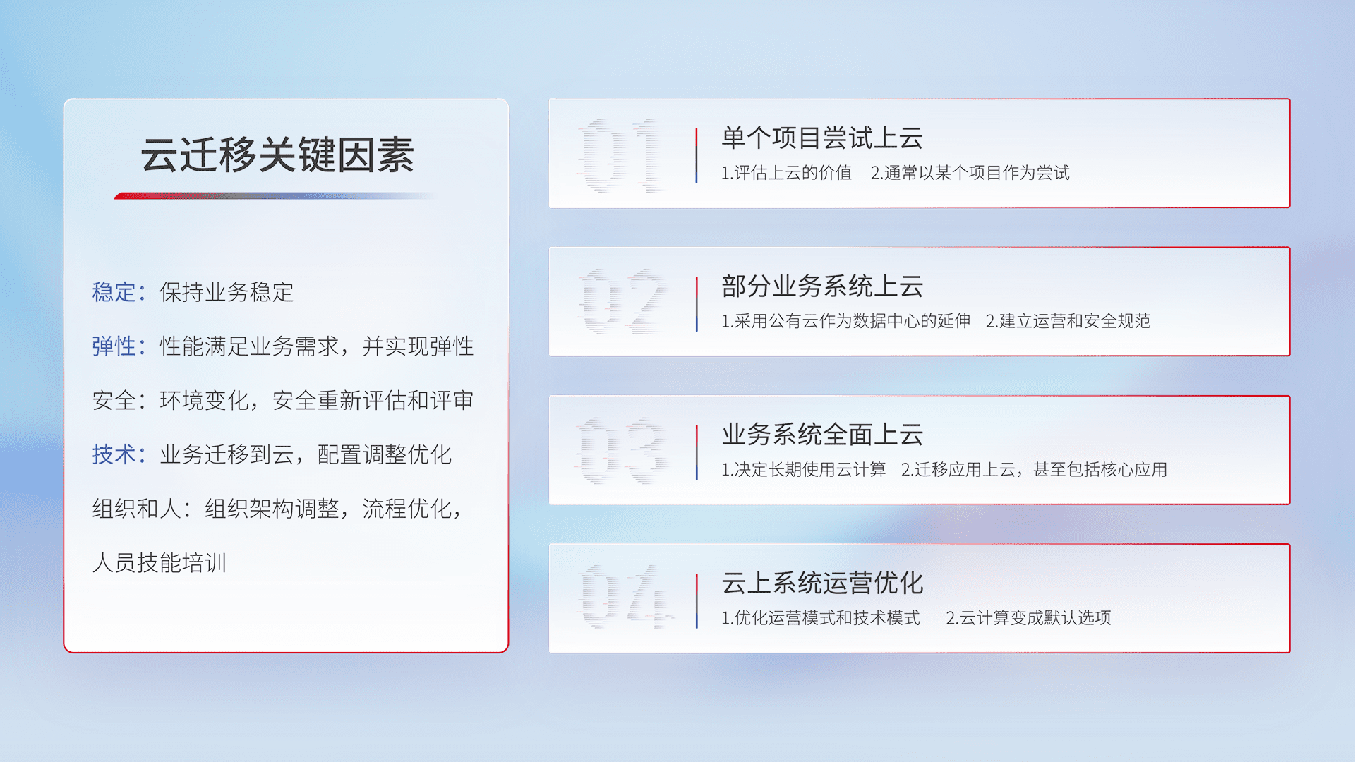 结合实际业务,,,,从规划设计、、云平台选型、、、云原生改造、、数据迁移、、集成交付,,,迁移全过程为客户识别最佳上云路径,,,,做好风险识别管理,,,设计网络架构、、、、身份权限、、、、安全审计合规、、、操作审计、、、、日志审计、、、、监控告警策略、、多站点容灾设计等,,对云上基础设施进行整体规划,,,,提升IT治理水平,,,,以满足弹性、、、、高可用、、、、高性能的需求。。