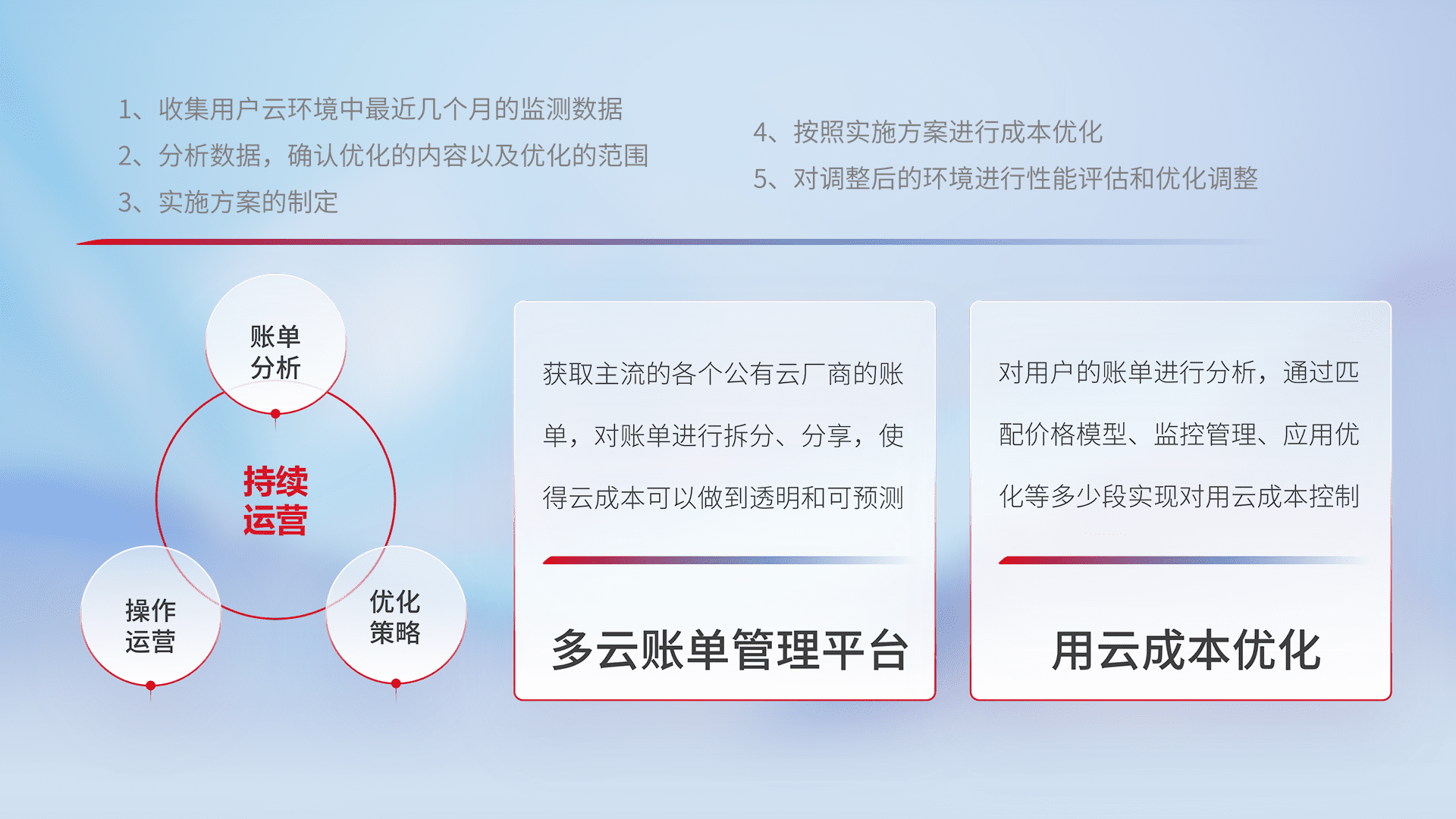 通过多云纳管,,,以统一的资源数据模型把客户的云资源进行抽象和封装,,进而实现对多云资源的统一操作,,保障云资源管理的可靠性、、、、稳定性与可用性。。量身定制化运维内容,,配置、、、、开发运维、、、补丁管理、、、备份、、监控、、、、认证和访问管理、、、、审计和日常巡检等,,保障在用云过程中的可靠度,,,稳定度以及高可用率。。。。